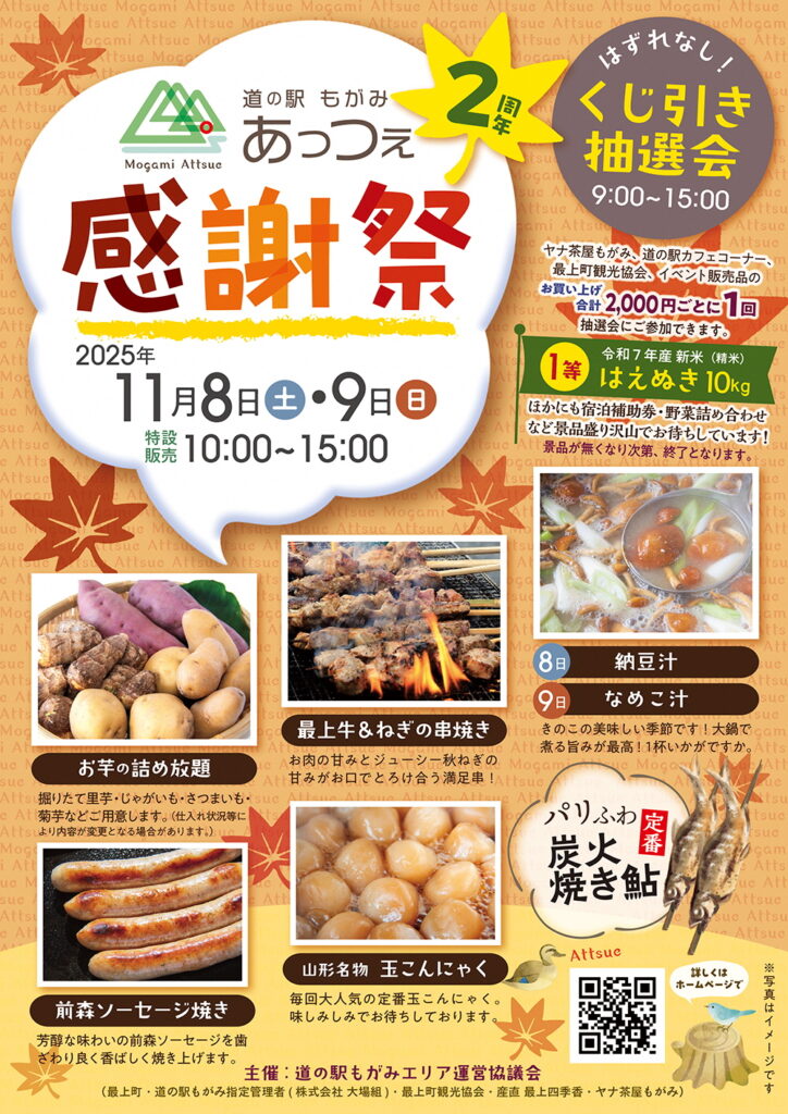 2025年11月8日、9日 道の駅もがみ「あっつぇ」2周年感謝祭を開催します。